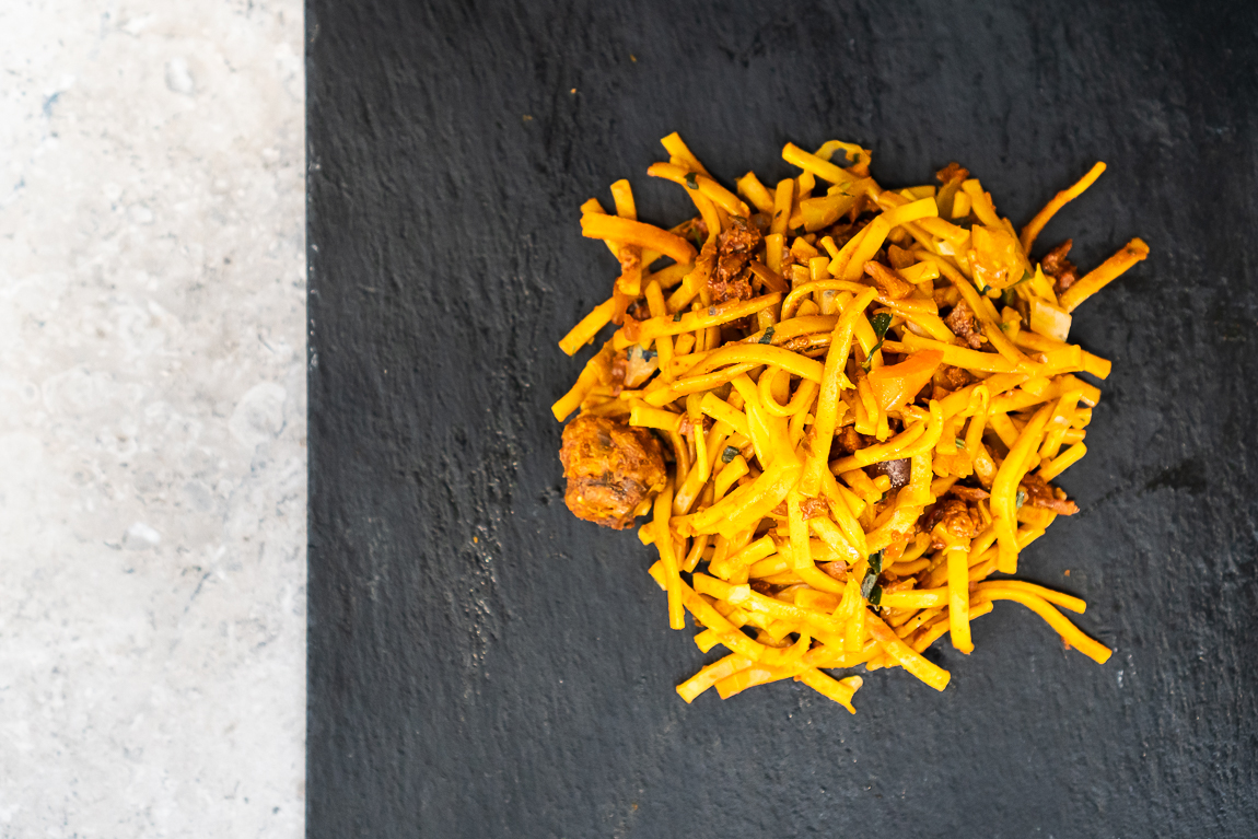 Huisgemaakte oudhollandse bami met groente en stukjes varkensvlees. Volgens oma Taam haar recept, alleen even opwarmen. Bereiding: 5 min. 600 W