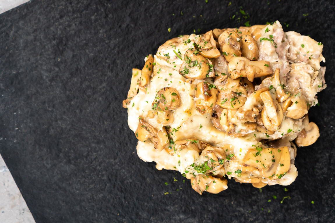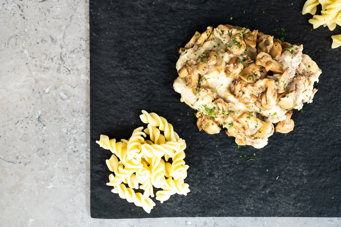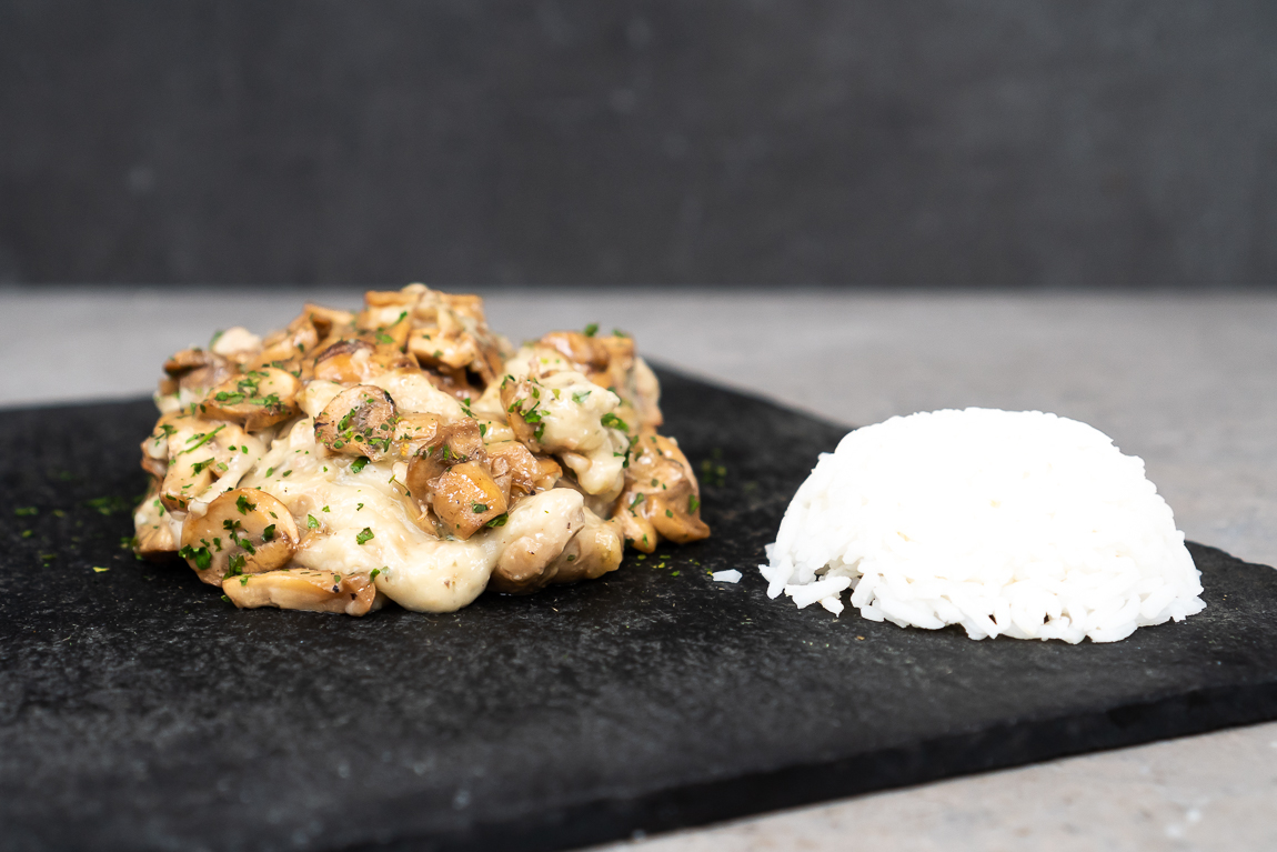 Huisgemaakt zacht gegaard kalfsvlees met champignons in roomsaus. Te combineren met pasta of rijst Alleen even opwarmen
