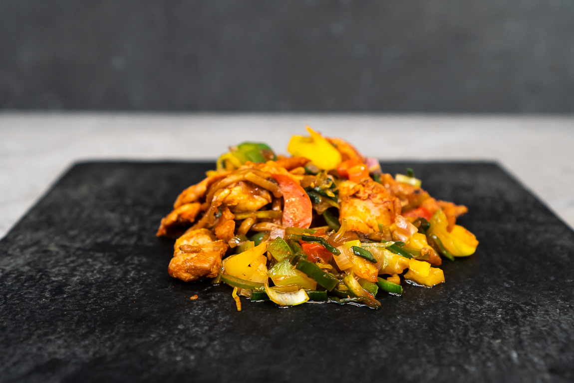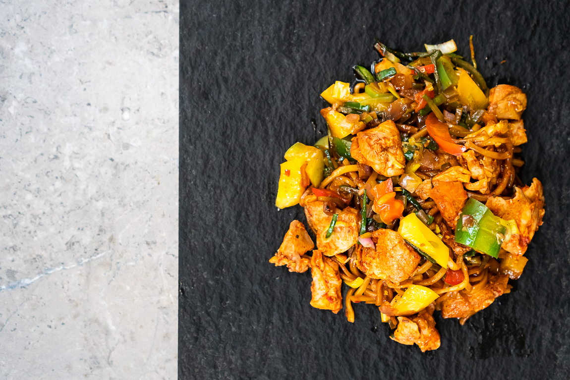 Oosterse mie met gebraden kippendijen en verse groente